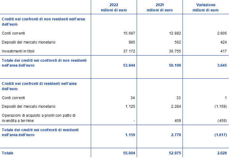 Includono le attività iscritte alle voci “Crediti denominati in valuta estera nei confronti di non residenti nell’area dell’euro - Saldi presso banche e investimenti in titoli, prestiti esteri e altre attività sull’estero” e “Crediti denominati in valuta estera nei confronti di residenti nell’area dell’euro”.