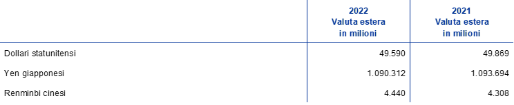 Si tratta di attività al netto delle passività denominate nelle divise che sono soggette a valutazione da cambio. Sono iscritte alle voci “Crediti denominati in valuta estera nei confronti di non residenti nell’area dell’euro”, “Crediti denominati in valuta estera nei confronti di residenti nell’area dell’euro”, “Ratei e risconti attivi”, “Differenze da valutazione su operazioni fuori bilancio” (passivo) e “Ratei e risconti passivi”; inoltre tengono conto delle operazioni a termine e di swap in valuta “fuori bilancio”. Non sono considerate le plusvalenze sugli strumenti finanziari denominati in valuta estera risultanti dalla valutazione a prezzi di mercato.