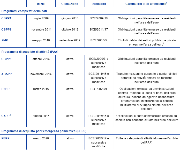 Il PAA è costituito dal terzo Programma per l’acquisto di obbligazioni garantite (third covered bond purchase programme, CBPP3), dal Programma di acquisto di titoli garantiti da attività (asset-backed securities purchase programme, ABSPP), dal Programma di acquisto per il settore pubblico (public sector purchase programme, PSPP) e dal Programma di acquisto per il settore societario (corporate sector purchase programme, CSPP). La BCE non acquista titoli nell’ambito del CSPP. Maggiori informazioni sul PAA sono reperibili nel sito Internet della BCE.