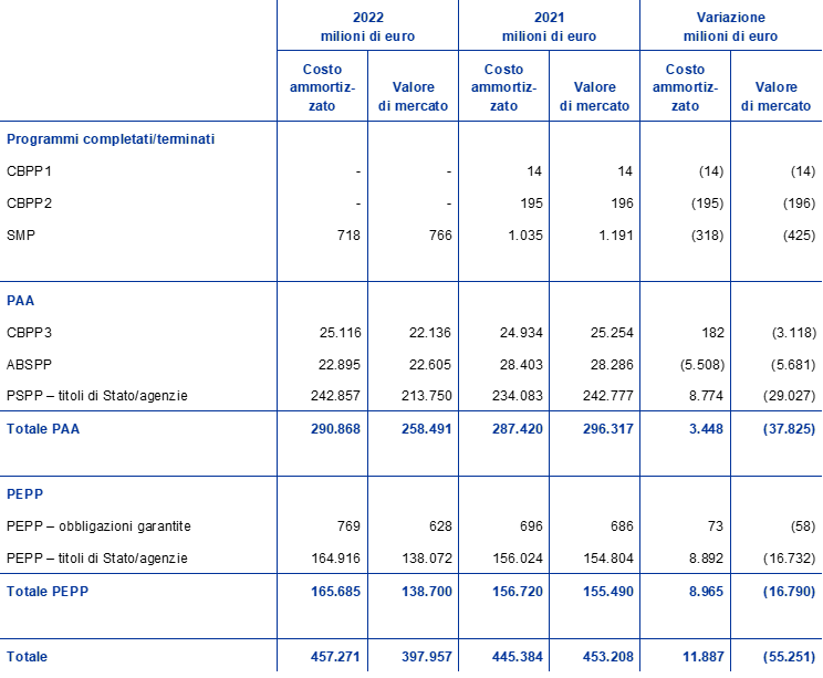 Sulla base delle relative decisioni del Consiglio direttivo, la BCE ha proseguito gli acquisti netti di attività del PEPP sino alla fine di marzo 2022, mentre quelli del PAA sono terminati il 1° luglio 2022. Al tempo stesso, la BCE ha continuato a reinvestire integralmente il capitale rimborsato sui titoli in scadenza dei due portafogli durante l’esercizio. A seguito di tali acquisti e reinvestimenti, il portafoglio dei titoli detenuti dalla BCE per finalità di politica monetaria è aumentato di 11,9 miliardi di euro collocandosi a 457,3 miliardi (grafico 2); le consistenze del PEPP e del PSPP hanno registrato rispettivamente un incremento di 9,0 miliardi di euro e di 8,8 miliardi. La diminuzione di 5,5 miliardi di euro delle consistenze dell’ABSPP è riconducibile ai rimborsi.