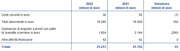 Nel 2022 il controvalore totale in euro delle riserve in valuta della BCE, costituite da oro, diritti speciali di prelievo, dollari statunitensi, yen giapponesi e renminbi cinesi, è aumentato di 4,1 miliardi di euro raggiungendo 84,5 miliardi.