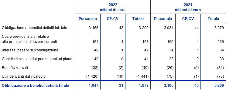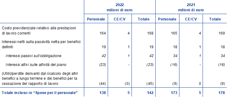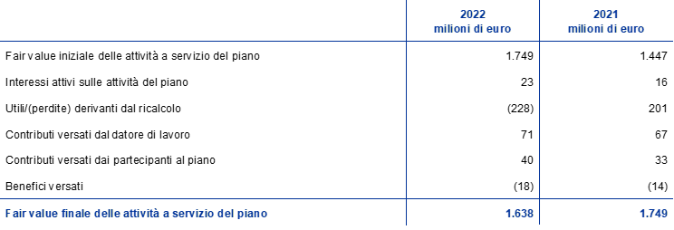 I contributi obbligatori della BCE e del personale sono versati esclusivamente nel fondo a benefici definiti. Nel 2022 i versamenti volontari effettuati dal personale nel fondo a contribuzione definita ammontano a 189 milioni di euro (220 milioni nel 2021). Tali versamenti sono investiti in attività a servizio del piano e danno luogo a un’obbligazione corrispondente di pari valore.