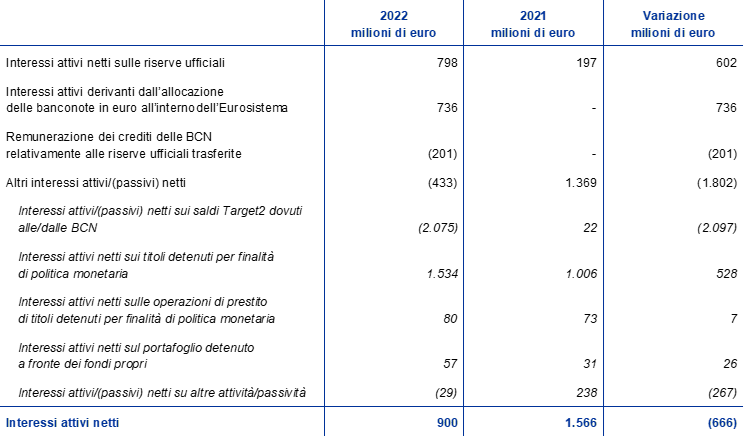 Gli interessi attivi netti della BCE si sono portati a 900 milioni di euro registrando una riduzione di 666 milioni (grafico 14) riconducibile soprattutto agli interessi passivi sul saldo netto Target2 della BCE. A tale riduzione hanno contribuito anche gli interessi passivi connessi alla remunerazione dei crediti delle BCN dei paesi dell’area dell’euro per il trasferimento delle riserve ufficiali alla BCE. Gli interessi passivi sono stati in parte compensati dall’aumento degli interessi attivi (1) sui crediti della BCE derivanti dall’allocazione delle banconote in euro all’interno dell’Eurosistema, (2) sulle riserve valutarie e (3) sui titoli detenuti per finalità di politica monetaria.