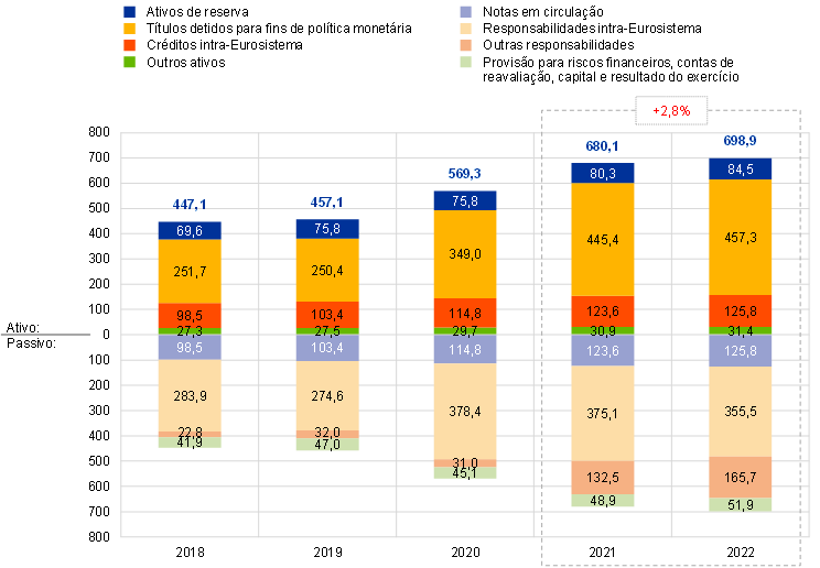 Em 2022, o balanço do BCE aumentou 18,7 mil milhões de euros, passando para 698,9 mil milhões de euros, devido sobretudo à quota do BCE nas aquisições de títulos ao abrigo do PEPP e do APP. Essas aquisições resultaram num aumento dos títulos detidos para fins de política monetária, tendo a liquidação em numerário das mesmas, através de contas no TARGET2, levado a um aumento correspondente das responsabilidades intra‑Eurosistema. Este aumento das responsabilidades intra‑Eurosistema foi mais do que compensado por entradas de caixa, em resultado de um volume mais elevado de depósitos de residentes na área do euro junto do BCE, o que resultou simultaneamente num aumento da rubrica “Outras responsabilidades”.