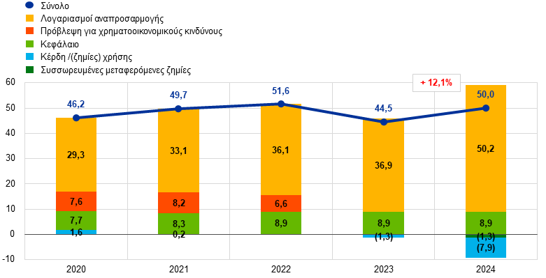 Ο ισολογισμός της ΕΚΤ μειώθηκε κατά 32,6 δισεκ. ευρώ το 2024, κυρίως λόγω της μείωσης των τίτλων που διακρατούνται για σκοπούς νομισματικής πολιτικής, καθώς οι επανεπενδύσεις ποσών κεφαλαίου από την εξόφληση τίτλων στο πλαίσιο του προγράμματος APP κατά τη λήξη τους τερματίστηκαν τον Ιούλιο του 2023 και οι εξοφλήσεις στο πλαίσιο του PEPP επανεπενδύθηκαν μόνο εν μέρει το β΄ εξάμηνο του 2024. | Η ζημία οφειλόταν και πάλι στους σημαντικούς τόκους-έξοδα επί της καθαρής υποχρέωσης στο πλαίσιο του TARGET και είναι συγκρίσιμη με τη ζημία ύψους 7.886 εκατ. ευρώ πριν από τη μεταφορά ποσού από τις προβλέψεις για κινδύνους το 2023. Δεδομένου ότι το 2023 αποδεσμεύθηκε το πλήρες ποσό της πρόβλεψης για χρηματοοικονομικούς κινδύνους, μειώνοντας τη ζημία για το εν λόγω έτος σε 1.266 εκατ. ευρώ, δεν κατέστη δυνατό να καλυφθούν ζημίες από την εν λόγω πρόβλεψη το 2024. |