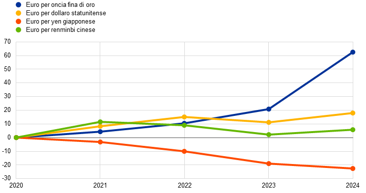 Il controvalore in euro delle disponibilità in oro della BCE, pari a 40,9 miliardi di euro a fine 2024 (grafico 4), mostra un incremento di 10,5 miliardi di euro dovuto al rialzo del prezzo di mercato dell’oro espresso in euro. Tale incremento ha determinato anche un corrispondente aumento dei conti di rivalutazione dell’oro della BCE (cfr. la sezione 1.3.2 “Patrimonio netto”).