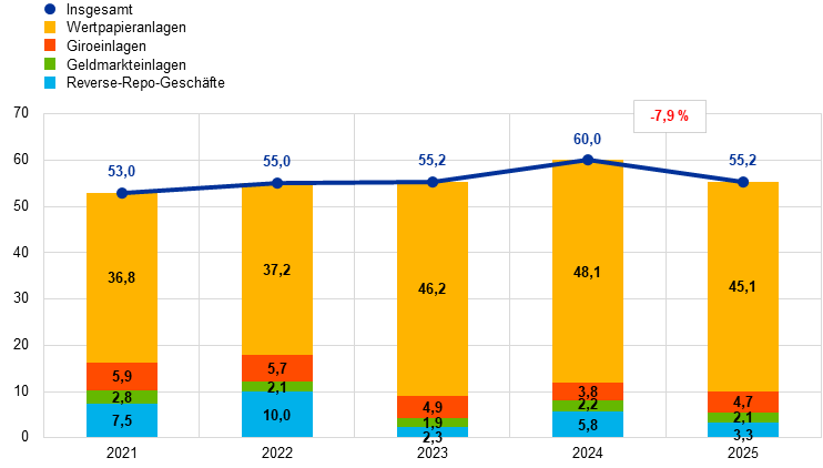 Anmerkung: Seit 2025 weist die EZB Anlagen von Barbeständen auf Taggeldbasis unter „Reverse-Repo-Geschäfte“ aus, wenn diese Mittel Teil eines Rückkaufpools sind. Die jeweiligen Salden für die Jahre 2021-2024 wurden dementsprechend von „Giroeinlagen“ in „Reverse-Repo-Geschäfte“ umgegliedert.
