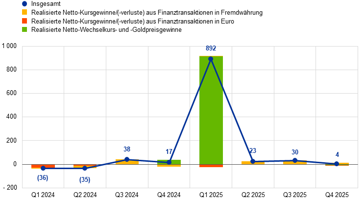 Im Jahr 2025 stieg der Euro-Gegenwert der Währungsreserven der EZB um 13,6 Mrd. € auf insgesamt 116,8 Mrd. €. Diese Währungsreserven bestehen aus Gold, Sonderziehungsrechten und Devisen (US-Dollar, japanische Yen und chinesische Renminbi).