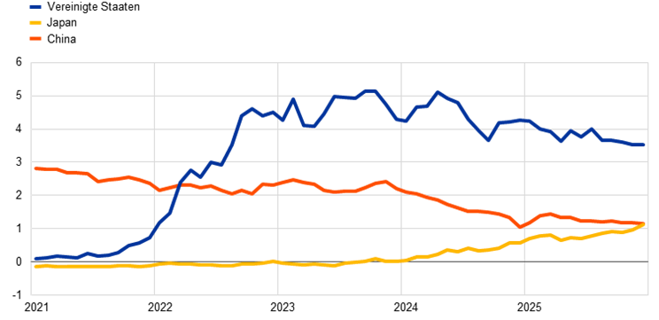 Die Fremdwährungsbestände[15] der EZB in US-Dollar, japanischen Yen und chinesischen Renminbi gingen 2025 in Euro um 4,8 Mrd. € auf 55,2 Mrd. € zurück (siehe Abbildung 5). Hauptgrund war die Abwertung des US-Dollar und des japanischen Yen gegenüber dem Euro. Die Abwertung des US-Dollar spiegelt sich auch in den gesunkenen Salden der Ausgleichsposten aus Neubewertung der EZB wider (siehe Abschnitt 1.3.2 „Nettoeigenkapital“). Gleichzeitig führte die Abwertung des japanischen Yen zu einer in der Gewinn- und Verlustrechnung zum Jahresende ausgewiesenen Wechselkursabschreibung. Grund dafür war, dass die entsprechenden Ausgleichsposten aus Neubewertung 2024 vollständig aufgebraucht worden waren (siehe Abschnitt 1.3.3 „Gewinn- und Verlustrechnung“). Trotz dieser Abschreibung erhöhte sich der Bestand an japanischen Yen infolge einer standardmäßigen Neugewichtung. Diese hatte das Ziel, die Zusammensetzung der Währungsreserven der EZB an die Zielallokation anzupassen. Im Rahmen dieser Neugewichtung veräußerte die EZB im ersten Quartal 2025 einen kleinen Teil ihrer US-Dollar-Bestände und reinvestierte die Erträge vollständig in japanische Yen.