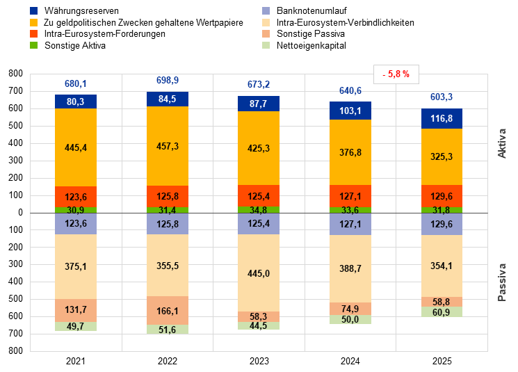 Im Jahr 2025 schrumpfte die Bilanz der EZB um 37,3 Mrd. € auf 603,3 Mrd. €. Dies war abermals auf Tilgungen von im Rahmen des APP und des PEPP gehaltenen Wertpapieren zurückzuführen. Diese Tilgungen hatten einen Rückgang des Bestands der zu geldpolitischen Zwecken gehaltenen Wertpapiere zur Folge. Gleichzeitig führte der Barausgleich dieser Transaktionen über TARGET-Konten zu einem entsprechenden Rückgang der Intra-Eurosystem-Verbindlichkeiten. Dieser Rückgang wurde durch die Mittelabflüsse aufgrund von geringeren Einlagen bei der EZB nur teilweise ausgeglichen, wodurch sich gleichzeitig die sonstigen Verbindlichkeiten verringerten.