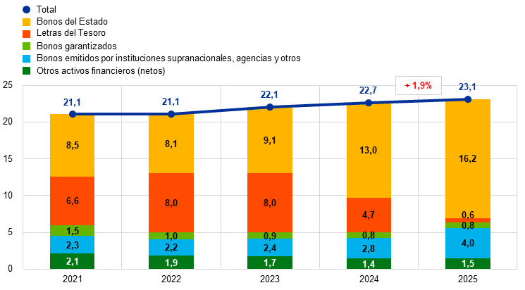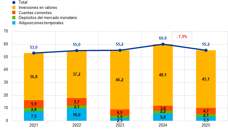 Nota: desde 2025, el BCE presenta las inversiones a un día de saldos en efectivo como «Adquisiciones temporales» si los fondos forman parte de un pool de recompra. En consecuencia, los saldos correspondientes del período 2021-2024 fueron reclasificados de «Cuentas corrientes» a «Adquisiciones temporales».