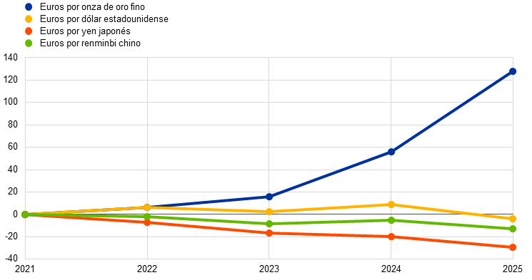 En 2025, el valor total equivalente en euros de los activos exteriores de reserva del BCE, formados por tenencias de oro, derechos especiales de giro, dólares estadounidenses, yenes japoneses y renminbis chinos, aumentó en 13,6 mm, situándose en 116,8 mm de euros.