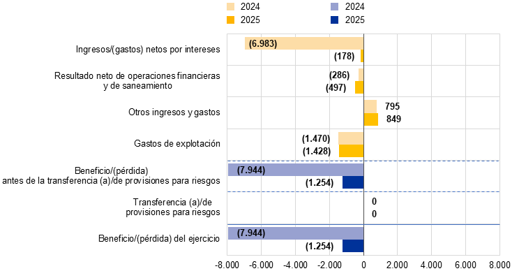 Las pérdidas de 2025, al igual que las de los dos ejercicios anteriores, se reconocen en el balance del BCE para su compensación con beneficios futuros. |