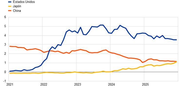 La posición del BCE en moneda extranjera en dólares estadounidenses, yenes japoneses y renminbis chinos calculada en euros se redujo en 4,8 mm, situándose en 55,2 mm de euros en 2025 (véase gráfico 5), debido principalmente a la depreciación del dólar y el yen frente al euro[15]. La depreciación del dólar también se refleja en los menores saldos de las cuentas de revalorización del BCE (véase apartado 1.3.2 «Patrimonio neto»), mientras que la depreciación del yen dio lugar a una minusvalía por tipo de cambio registrada en la cuenta de pérdidas y ganancias a final del ejercicio, ya que las cuentas de revalorización relacionadas se habían agotado completamente en 2024 (véase apartado 1.3.3 «Cuenta de pérdidas y ganancias»). A pesar de esta minusvalía, las tenencias de yenes aumentaron como resultado de un reequilibrio estándar para alinear la composición de las reservas exteriores del BCE con la asignación objetivo. Como parte de este reequilibrio, el BCE vendió durante el primer trimestre de 2025 una pequeña parte de sus tenencias de dólares y reinvirtió íntegramente los ingresos obtenidos en yenes.