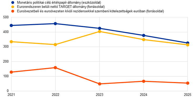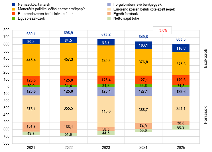 2025-ben az EKB mérlegfőösszege 37,3 milliárd €-val 603,3 milliárd €-ra tovább csökkent, ismét főként a PEPP és az APP keretében szerzett értékpapír-állományok visszaváltása nyomán. A visszaváltások révén a monetáris politikai célú értékpapír-állomány zsugorodott, és az eurorendszeren belüli kötelezettségek ennek megfelelően szintén visszaestek a vásárlások TARGET-számlákon keresztüli készpénzes kiegyenlítésének közvetítésével. Ezt a visszaesést csak részben ellensúlyozták az EKB-nál elhelyezett kisebb betétállományokból származó pénzkiáramlások, amelyek az egyéb kötelezettségek egyidejű esését eredményezték.