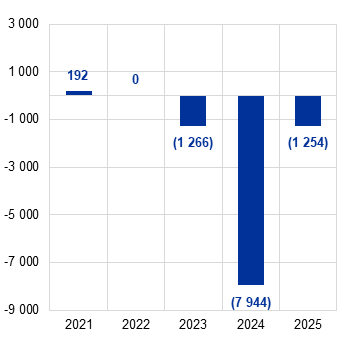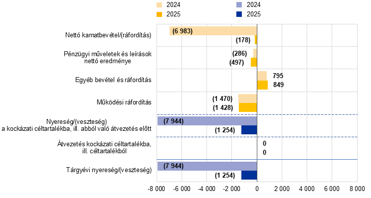 Az EKB vesztesége 2025-ben 1254 millió € volt, szemben a 2024-es 7944 millió €-s veszteséggel. A Kormányzótanács határozata alapján ezt a veszteséget átvezetik az EKB mérlegébe, és a jövőbeli nyereség terhére kerül elszámolásra.