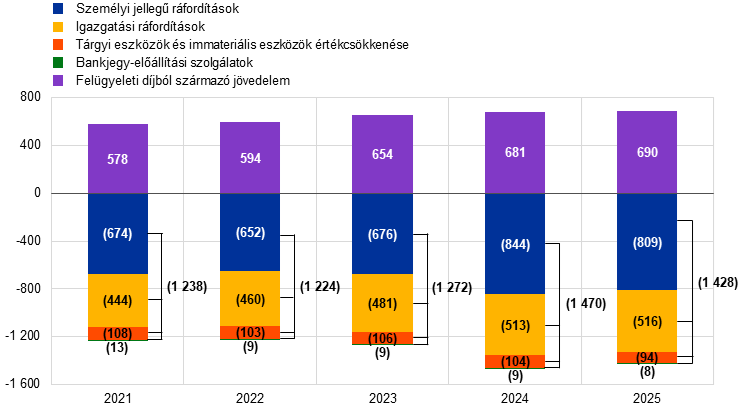 Bankfelügyelet – az egységes felügyeleti mechanizmus (SSM) | Az EKB-nak a bankfelügyeleti feladatai kapcsán keletkező éves kiadásait a felügyelt szervezetekre kivetett éves felügyeleti díjból fedezik. A díjat az eredménykimutatásban a „Díjakból, jutalékokból eredő nettó bevétel/ráfordítás” alatt kell kimutatni. |