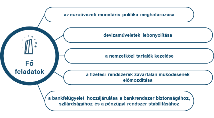 Az EKB az eurorendszer tagja, amely rajta kívül az eurót közös valutaként használó európai uniós tagállamok nemzeti központi bankjait (NKB-k) tömöríti magában.[4] Az eurorendszer elsődleges célja az árstabilitás fenntartása. Feladatait úgy látja el, ahogy azt az Európai Unió működéséről szóló szerződésben[5], valamint a Központi Bankok Európai Rendszere és az Európai Központi Bank alapokmányában (a KBER alapokmánya)[6] előírják (1. ábra). Az EKB tevékenysége megbízatásának teljesítésére, nem pedig nyereségszerzésre irányul.