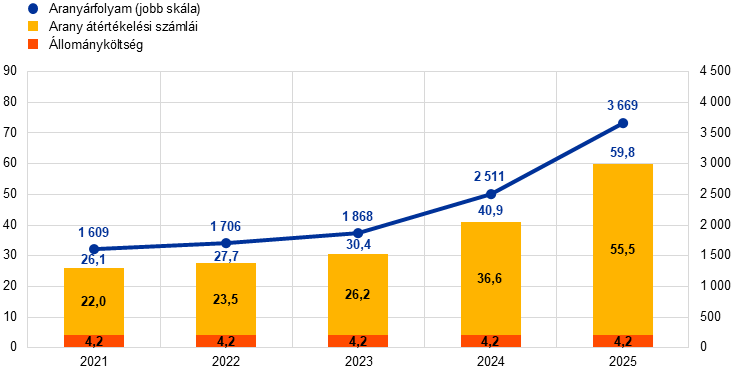 Az EKB aranykészleteinek és aranyköveteléseinek euróban kifejezett értéke 2025-ben 18,9 milliárd €-val 59,8 milliárd €-ra emelkedett (4. diagram), aminek fő oka az euróban kifejezett piaci aranyárfolyam megemelkedése. A növekedés az EKB aranyátértékelési számláinak ezzel egyenértékű emelkedéséhez is vezetett (lásd az 1.3.2. „Nettó saját tőke” pontot).