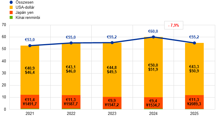 Az EKB devizatartalékának fő alkotóeleme továbbra is az USA-dollár, amely 2025 végén a teljes állomány 78%-át tette ki.
