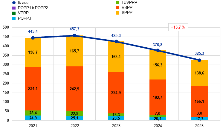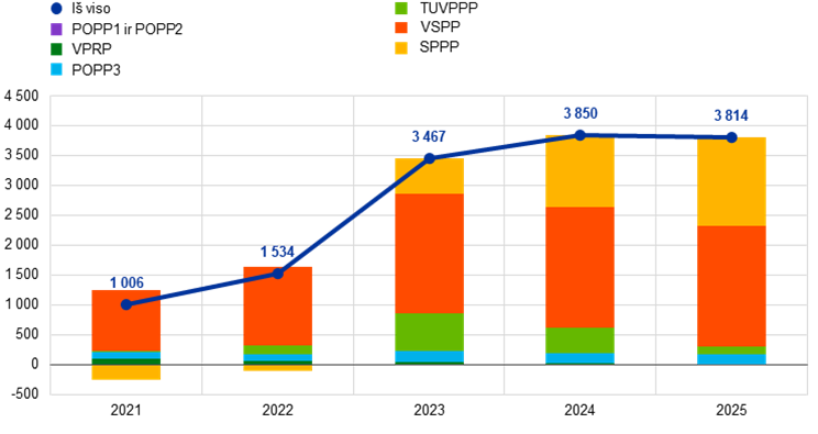 Vadovaudamasi atitinkamais Valdančiosios tarybos sprendimais, Eurosistema nustojo investuoti pagrindines sumas, gautas iš pagal TPP ir SPPP įsigytų vertybinių popierių išpirkimo, suėjus jų terminui, atitinkamai nuo 2023 m. liepos mėn. ir 2024 m. pabaigos. Dėl šių sprendimų ECB pinigų politikos tikslais laikomų vertybinių popierių portfelis mažėja nustatytu ir numatomu tempu. 2025 m. pinigų politikos portfeliai sumažėjo iš viso 51,5 mlrd. – iki 325,3 mlrd. eurų (žr. 2 pav.). VSPP, TUVPPP ir POPP3 portfeliams sumažėjus atitinkamai 26,5 mlrd., 4,0 mlrd. ir 3,1 mlrd. eurų, TPP portfelis sumažėjo 33,7 mlrd. – iki 186,5 mlrd. eurų. SPPP portfelis sumažėjo 17,8 mlrd. – iki 138,6 mlrd. eurų.