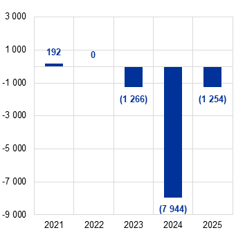 Strata ECB za rok 2025 predstavovala 1 254 mil. €, v porovnaní so stratou 7 944 mil. € za rok 2024. Na základe rozhodnutia Rady guvernérov sa táto strata v súvahe ECB prenesie do ďalšieho obdobia a bude vyrovnaná z budúcich ziskov.