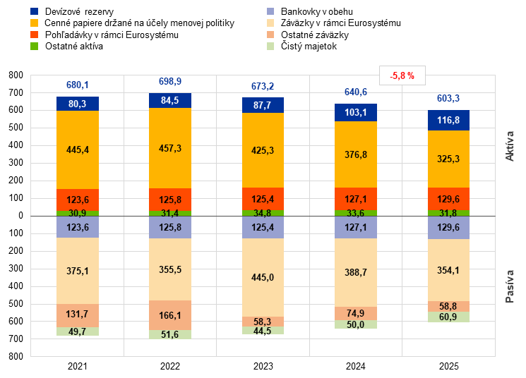 V roku 2025 redukcia súvahy ECB pokračovala, o 37,3 mld. € na 603,3 mld. €, opäť predovšetkým v dôsledku splácania cenných papierov v rámci programov APP a PEPP. Splácanie viedlo k zníženiu stavu cenných papierov držaných na účely menovej politiky, zatiaľ čo peňažné vyrovnanie týchto transakcií prostredníctvom účtov v systéme TARGET viedlo k zodpovedajúcemu poklesu záväzkov v rámci Eurosystému. Tento pokles bol len čiastočne kompenzovaný odlevom hotovosti v dôsledku nižších vkladov v ECB, čo zároveň viedlo k zníženiu ostatných záväzkov.