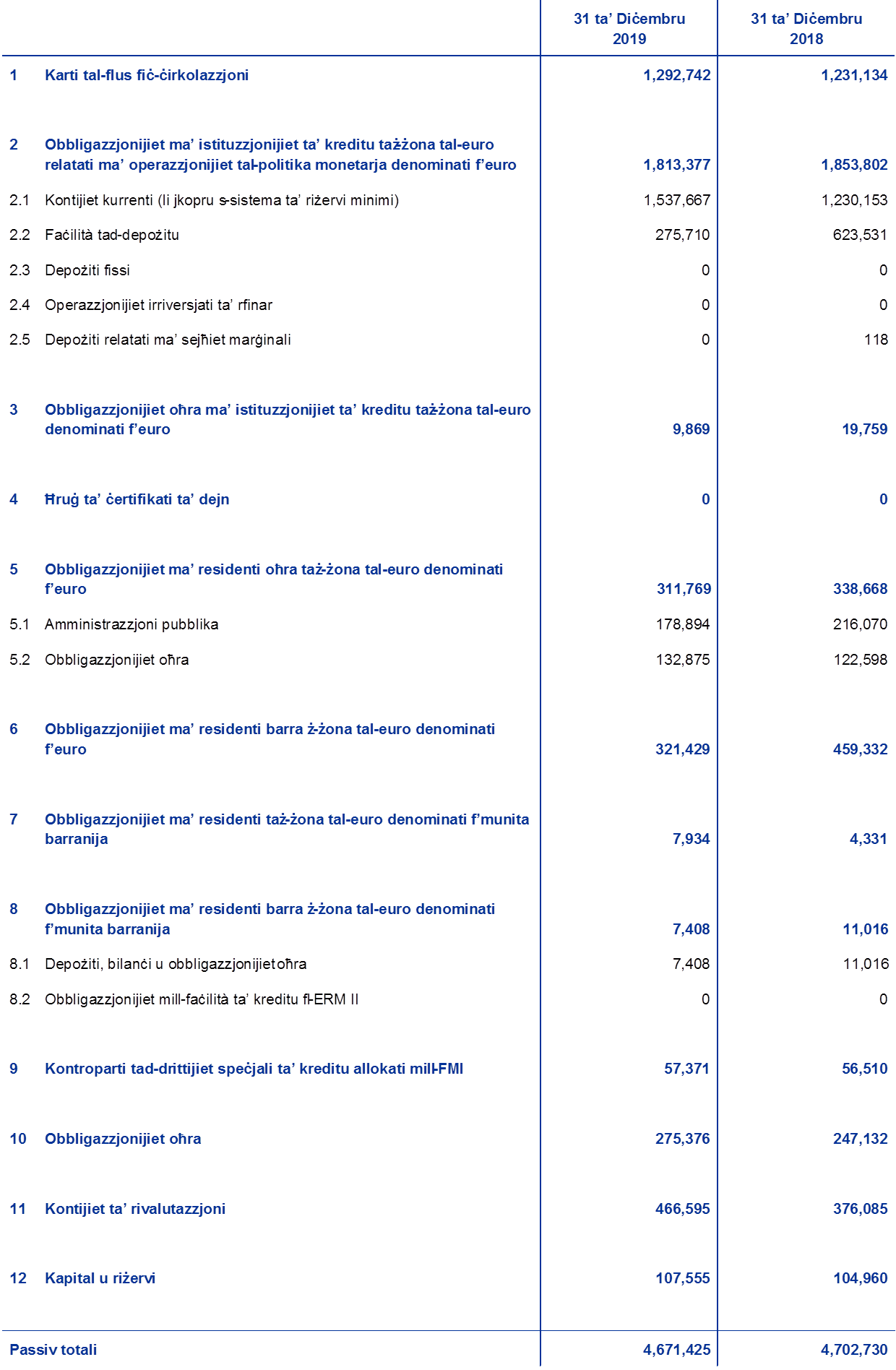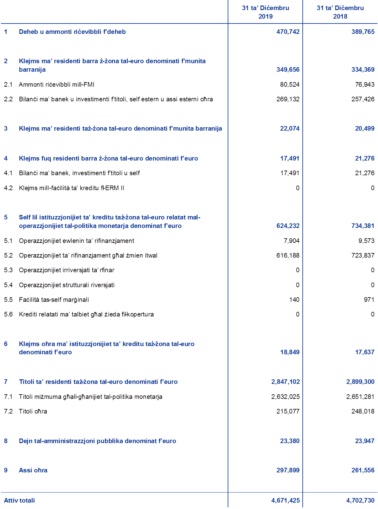Karta tal-bilanċ konsolidata tal-Eurosistema sal-31 ta’ Diċembru 2019