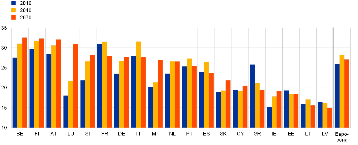 Забележка: Без Гърция, тъй като тя е статистически нетипичен случай със съотношение „дълг/БВП“ в размер на 176,1% през 2017 г. и намаление на общите разходи, свързани със застаряването, с 4,6% от БВП.