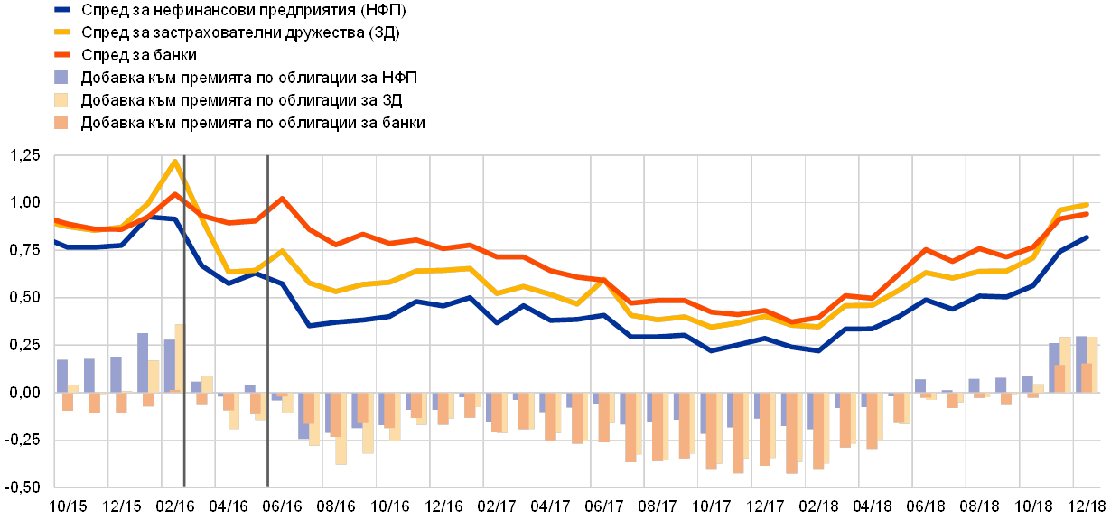 22. Например облигациите, емитирани от банки, високодоходните облигации и тези, чиято купонна структура не е допустима за търгуване. По-ниските доходност и спредове на закупените от Евросистемата облигации представляват за инвеститорите стимул да преструктурират своите портфейли, пренасочвайки се към вложèния в активи, характеризиращи се със сходен рисков профил, но с по-висока очаквана доходност.