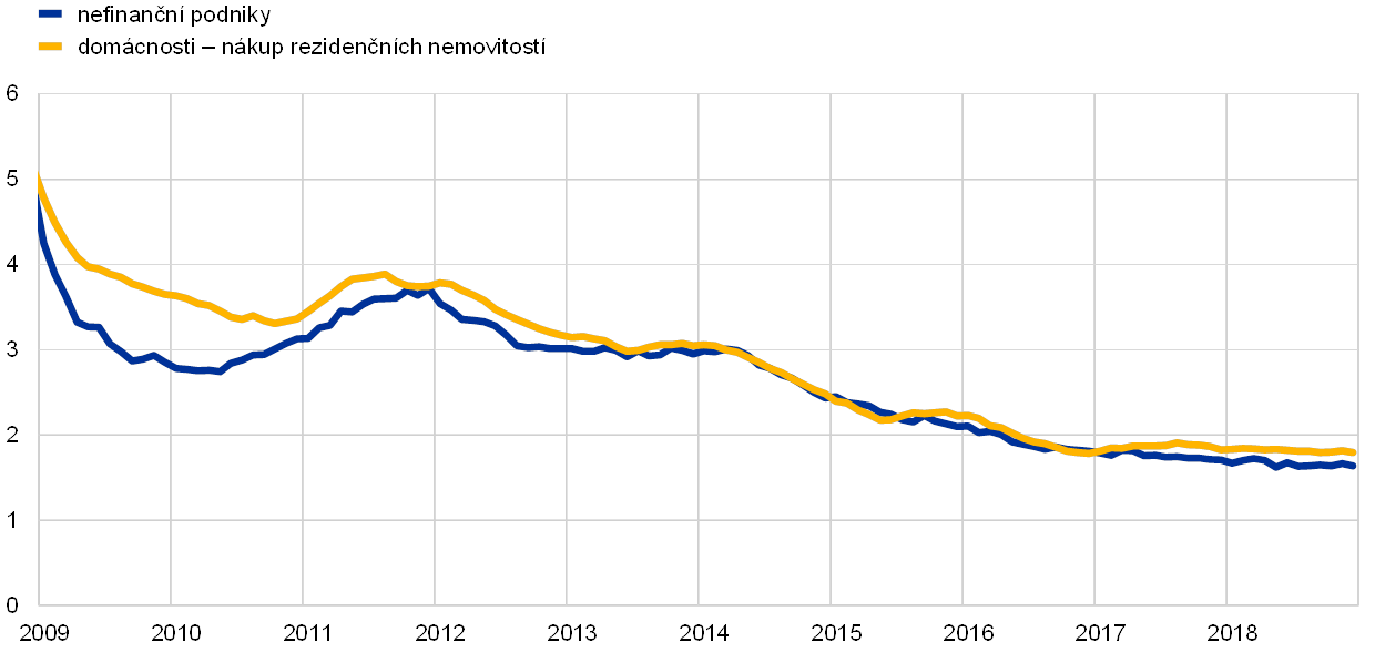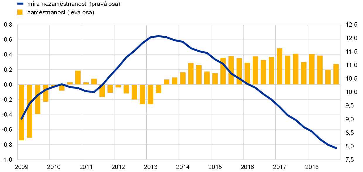 Po výjimečně silné dynamice růstu v roce 2017 pokračovala hospodářská expanze eurozóny i v roce 2018, i když mírnějším tempem, jelikož vnější poptávka zeslábla a růst tlumily faktory specifické pro jednotlivé země a sektory. Faktory podporující domácí poptávku zároveň zůstávaly v platnosti. Další zlepšení na trzích práce podporovalo soukromou spotřebu, přičemž podnikové investice dále těžily z příznivých podmínek financování a zlepšení bilancí. Pokračující expanze a rostoucí napětí na trzích práce se také promítly do pokračujícího posilování a rozšiřování domácích nákladových tlaků. Ukazatele jádrové inflace zůstaly zároveň obecně utlumené. Z hlediska dalšího vývoje by však jádrová inflace měla ve střednědobém výhledu růst, v čemž by ji měla podpořit měnověpolitická opatření ECB, probíhající hospodářská expanze a rostoucí růst mezd.