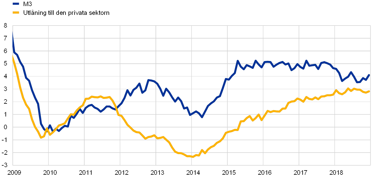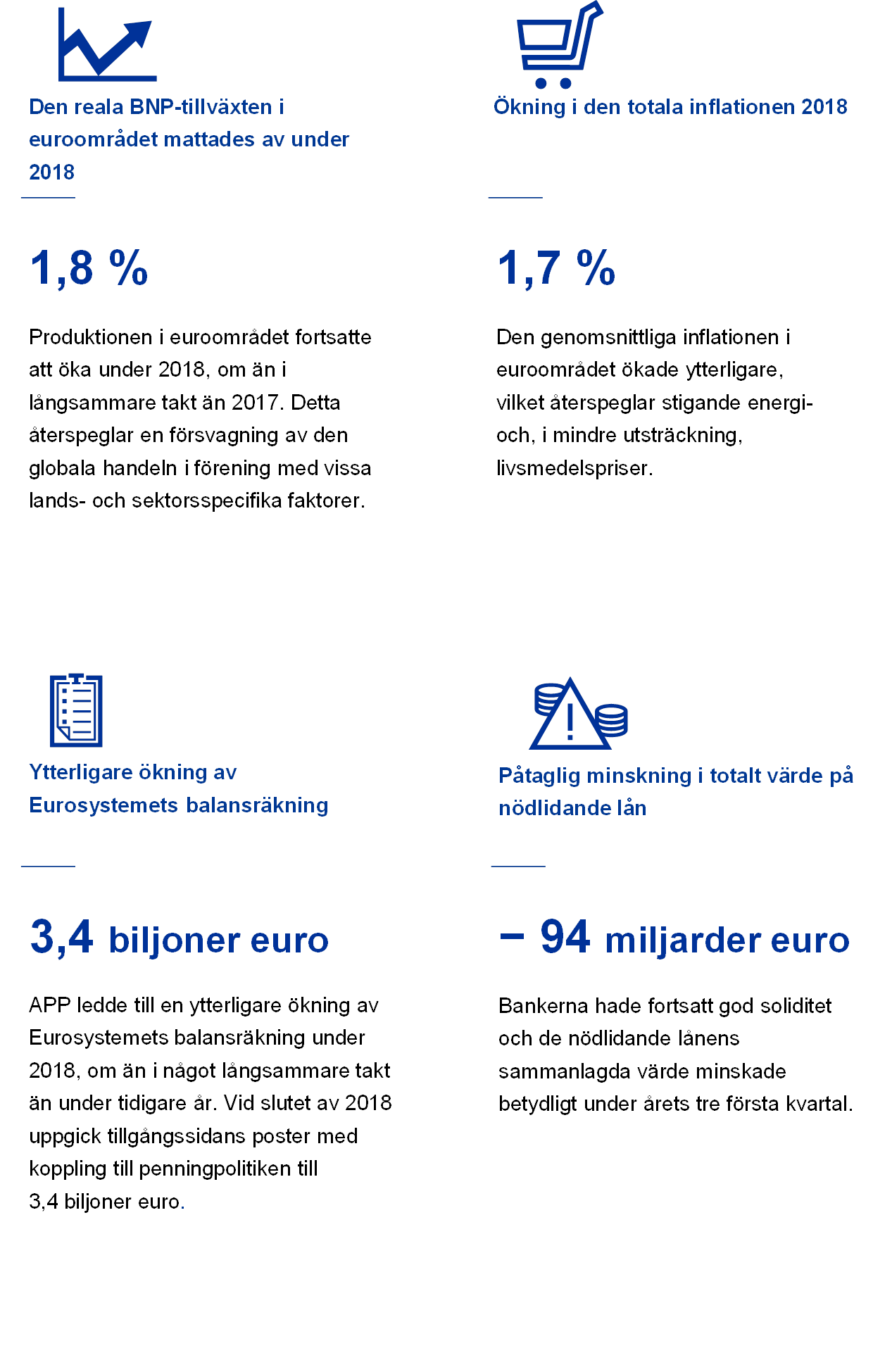 Efter den exceptionellt starka tillväxten under 2017 fortsatte euroområdets ekonomiska expansion under 2018, om än i något måttligare takt, då den externa efterfrågan försvagades och vissa lands- och sektorsspecifika faktorer dämpade tillväxten. Samtidigt kvarstod de underliggande drivkrafterna för den inhemska efterfrågan. Fortsatta förbättringar på arbetsmarknaden bidrog till hushållens konsumtion, medan företagsinvesteringarna fortsatte att gynnas av fördelaktiga finansieringsvillkor och förbättrade balansräkningar. Den pågående expansionen och stramare arbetsmarknader ledde också till en fortsatt förstärkning och utökning av det inhemska kostnadstrycket. Samtidigt var måtten på underliggande inflation generellt fortsatt dämpade. Inför framtiden väntas den underliggande inflationen dock öka på medellång sikt, med stöd av ECB:s penningpolitiska åtgärder, den fortsatta ekonomiska expansionen och ökande lönetillväxten.