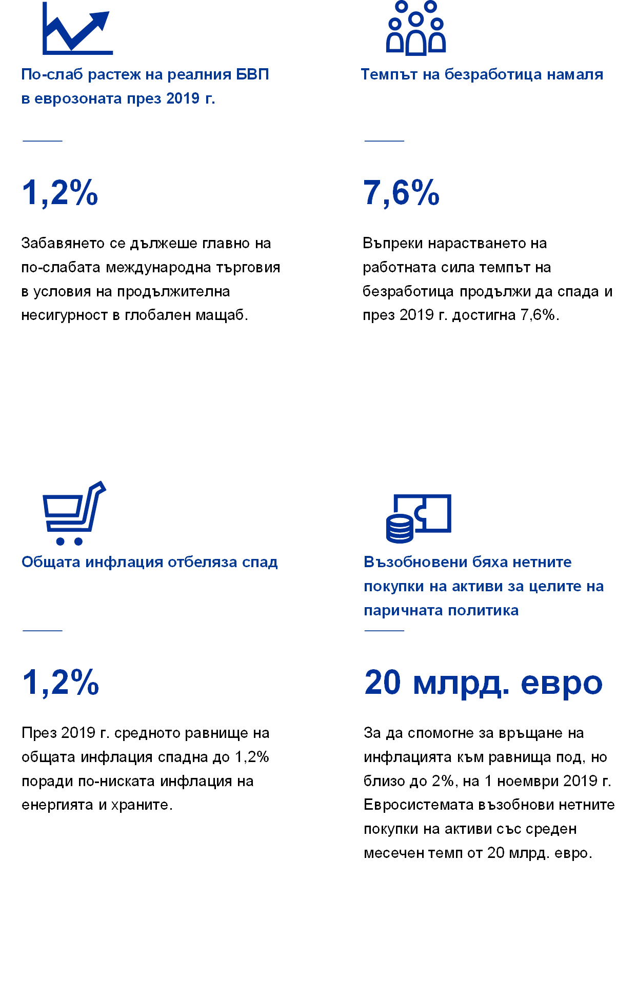 След достигнатия в средата на 2018 г. връх световната икономика през 2019 г. съществено забави темповете си при рязко засилване на несигурността, свързана с търговията. Спадът беше всеобхватен и едновременен по страни. При тези условия икономическият растеж в еврозоната продължи да се забавя до 1,2% спрямо 1,9% през предходната година. Забавянето на растежа през 2019 г. се дължеше главно на по-слабата международна търговия при продължителен период на несигурност в световен мащаб. Същевременно спадът беше смекчен от благоприятните условия на финансиране, по-нататъшното увеличаване на заетостта и на работните заплати, умерено експанзионистичната фискална позиция на еврозоната и продължаващото, макар и с по-бавни темпове, засилване на глобалната икономическа активност. Пазарът на труда в еврозоната продължи да се подобрява, но растежът на производителността се забави значително. Инфлационният натиск остана като цяло слаб. Общата инфлация спадна до 1,2% поради по-ниската инфлация при енергията и храните, а базисната инфлация остана ниска. Благоприятните условия за финансиране продължиха да стимулират растежа на парите и кредита. Доходността на държавните облигации на страните от еврозоната намаля съществено, докато цените на акциите в еврозоната се повишиха главно за сметка на по-ниските сконтови проценти. Благосъстоянието на домакинствата беше стимулирано от по-високата оценка на материалните и финансовите активи.