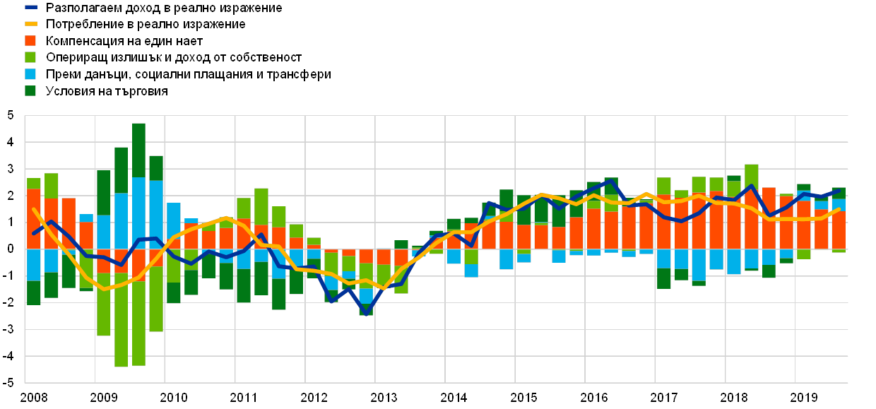 Растежът на частното потребление през 2019 г. се поддържаше от продължаващия растеж на реалния разполагаем доход, който на свой ред беше подкрепен от устойчивия пазар на труда. За доходите от труд благоприятно влияние оказаха продължаващото повишаване на работните заплати, както и допълнителното, макар и с по-бавни темпове нарастване на заетостта. Освен това преките данъци, социалните плащания и трансфери изглежда като цяло са имали слабо положително въздействие върху растежа на доходите за разлика от 2018 г., когато все още го потискаха (виж графика Б). Приносът обаче на показателя „опериращ излишък и доход от собственост“, който обичайно е тясно свързан с икономическата активност, през 2019 г. стана слабо отрицателен, след като от 2015 г. насам беше положителен.