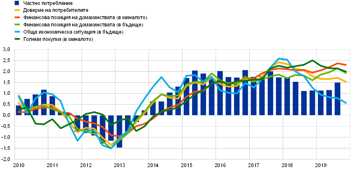 Благоприятните тенденции на пазара на труда наред с увеличаващите се заплати и в съчетание с добрите условия за финансиране и подобряващото се финансово положение на домакинствата обясняват в голяма степен защо през 2019 г. доверието на потребителите в еврозоната остава високо, подпомагайки частното потребление. В условията на устойчиво вътрешно търсене, съпроводено със слабо външно търсене, ЕЦБ продължава внимателно да наблюдава постъпващите данни, за да оцени риска от негативни вторични ефекти върху вътрешния сектор от страна на външния сектор.