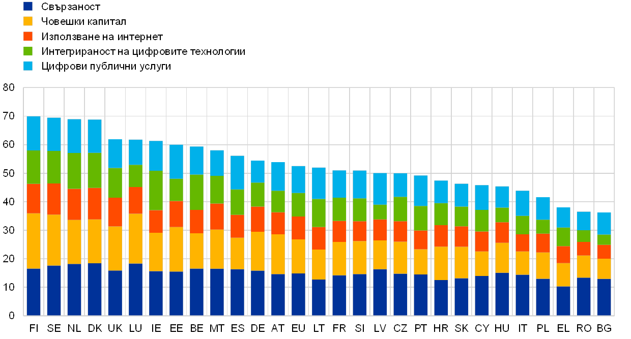 Според научната литература цифровизацията оказва влияние върху редица ключови икономически променливи, които са от значение за паричната политика. Емпиричните данни относно ефектите от цифровизацията сочат, че те вероятно стимулират активността и производителността, въпреки че цялостното им отражение върху инфлацията още е неясно.[9] През 2019 г. според индекса на цифровизация на икономиката и обществото (DESI) на Европейската комисия степента на цифровизация на икономиките в ЕС варираше от приблизително 40 при най-слабо цифровизираните до около 70 при най-високо цифровизираните икономики (виж графика 8). Въпреки че икономиките на ЕС постигнаха като цяло сходни резултати по отношение на свързаност, те показаха по-слаба хомогенност при човешкия капитал, използването на интернет, интегрираността на цифровите технологии и цифровите публични услуги.