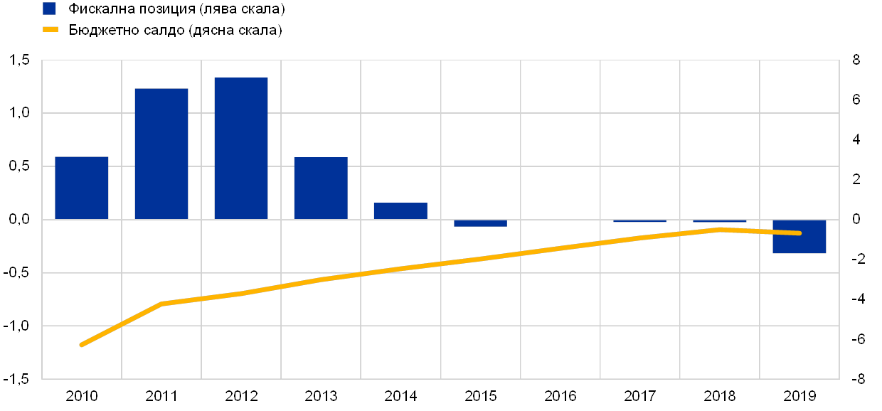 - Фискалната позиция отразява посоката и размера на стимулите, които фискалната политика създава за икономиката, извън автоматичната реакция на публичните финанси спрямо бизнес цикъла. Тя се измерва като изменение на съотношението на циклично изгладеното първично бюджетно салдо към БВП, без да се включва държавната помощ за финансовия сектор. За повече информация относно концепцията за фискалната позиция на еврозоната виж статията The euro area fiscal stance, Economic Bulletin, Issue 4, ECB, 2016.