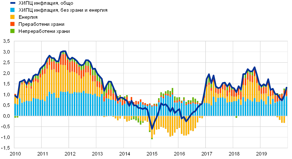 Средното равнище на общата инфлация за 2019 г. бе 1,2% – спад спрямо нивото от 1,8% през 2018 г. Този спад отразява по-нисък принос на двата най-колебливи компонента – енергията и храните. Ако изключим тях, средното равнище на инфлацията през 2019 г. е 1,0% – същото като през предходните две години.