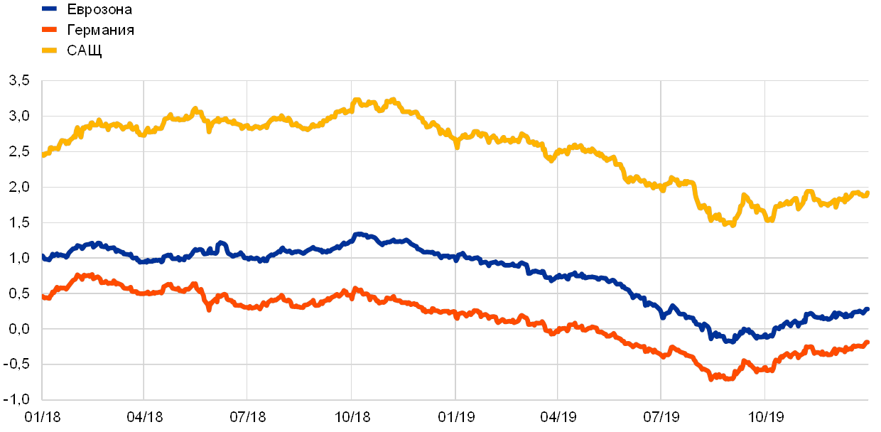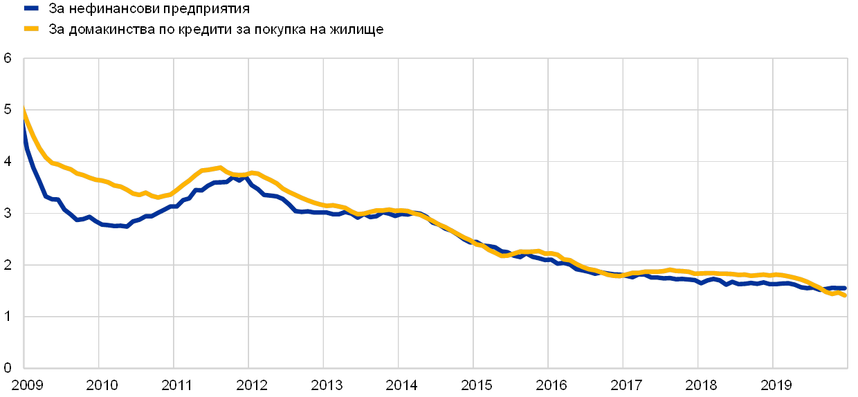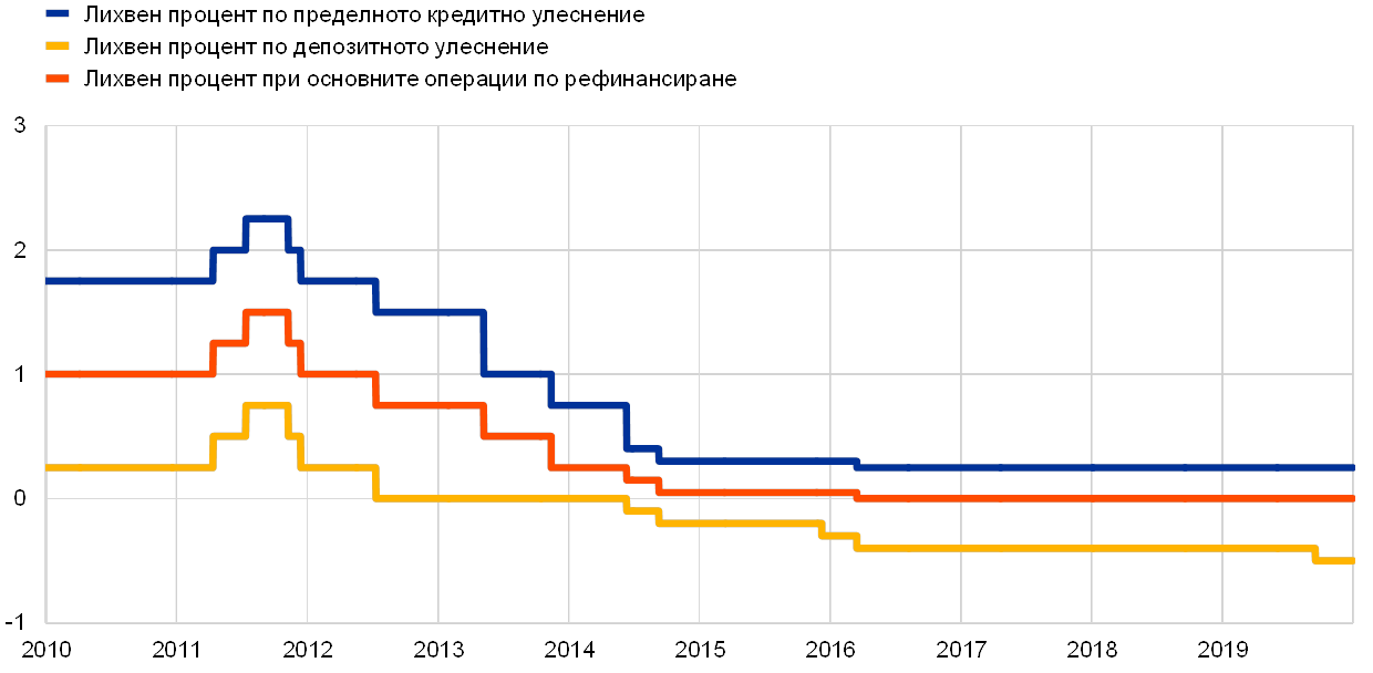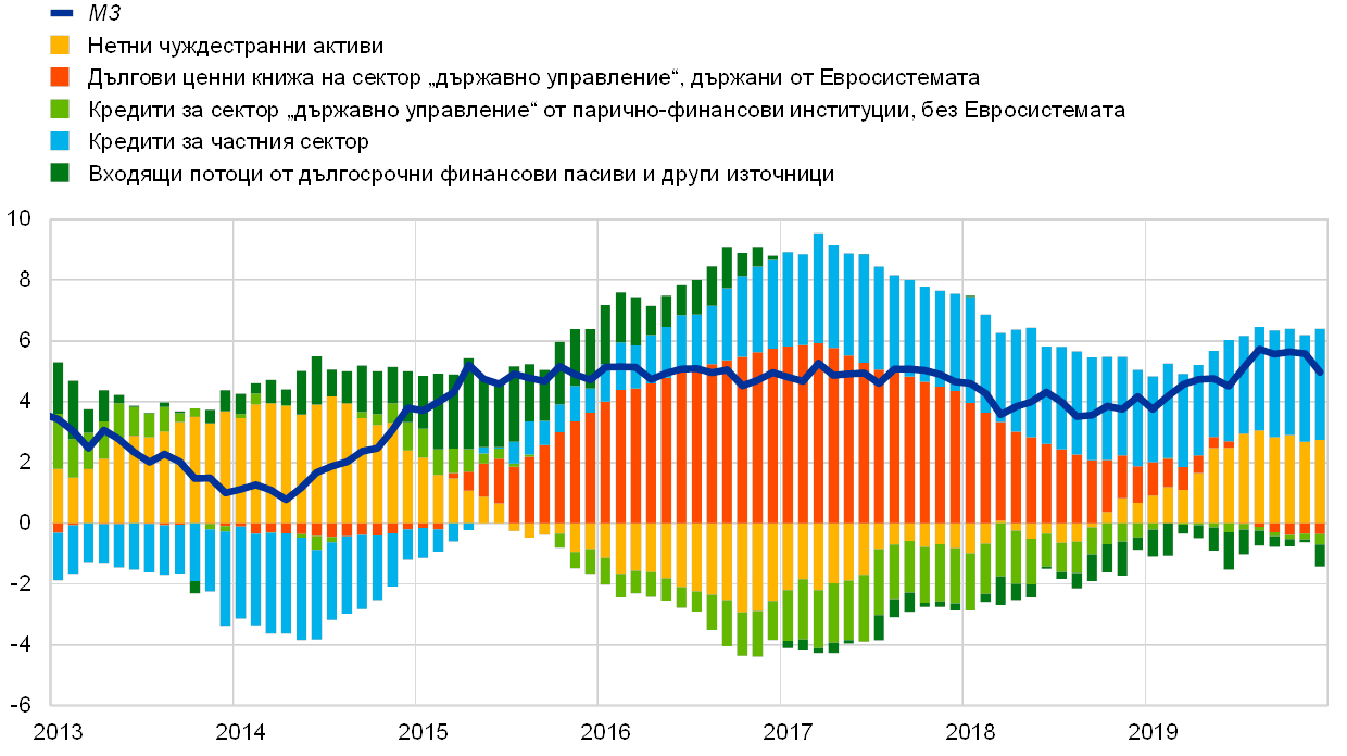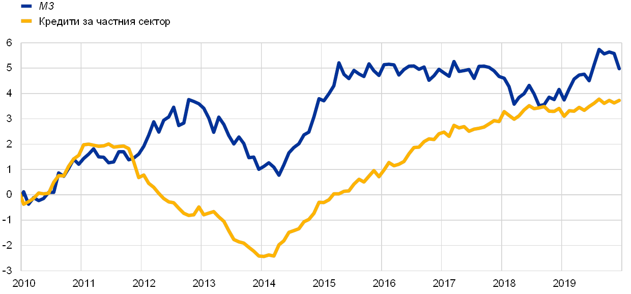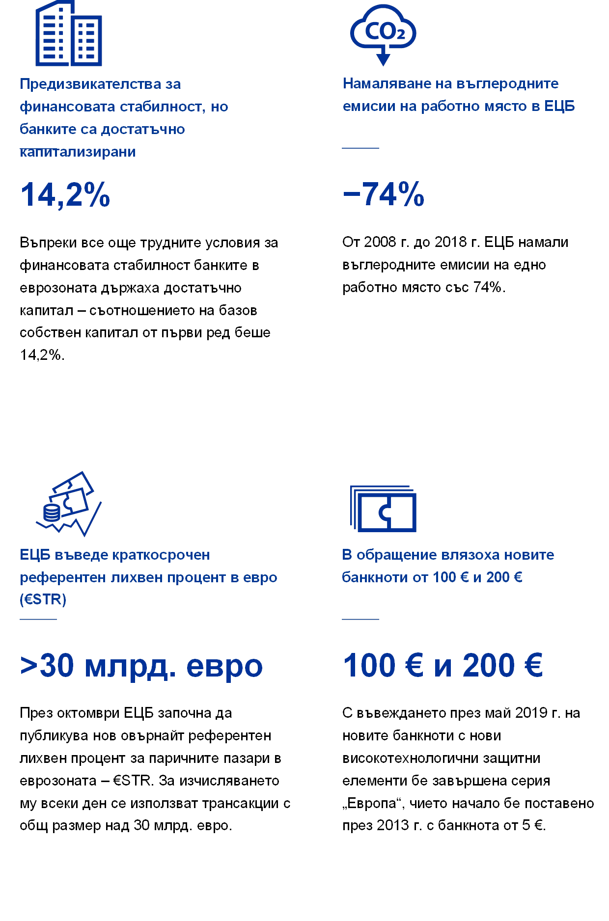 При тези условия Управителният съвет на ЕЦБ прие през 2019 г. три последователни решения за по-нататъшно смекчаване на паричната политика. Мерките включваха нова поредица целеви операции по дългосрочно рефинансиране, разширяване на ориентира за паричната политика, намаляване на лихвения процент по депозитното улеснение и възобновяване на програмата за закупуване на активи. Към края на 2019 г. се наблюдаваха известни начални признаци на стабилизация в динамиката на растежа и леко нарастване на базисната инфлация.