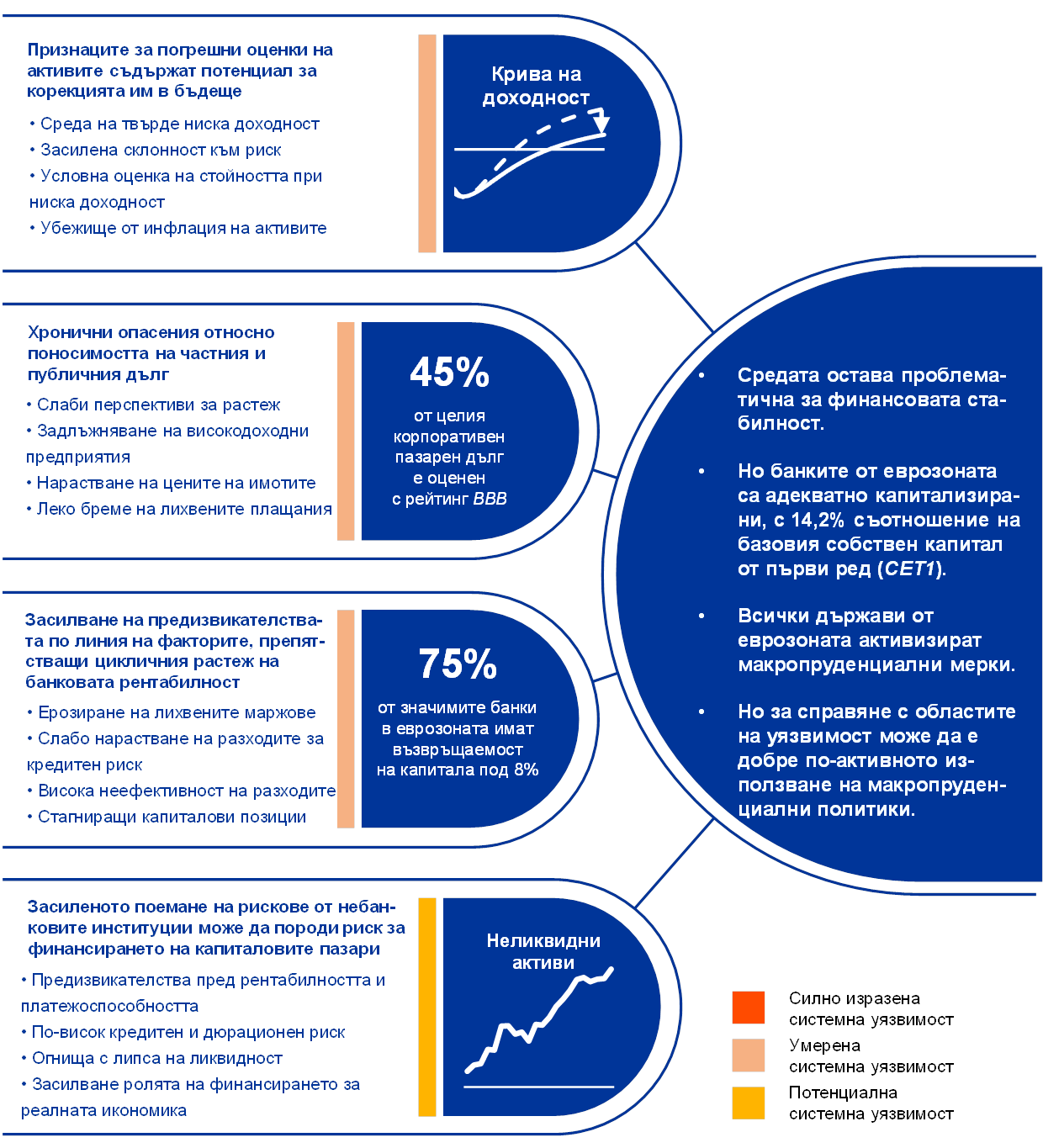 В структурно отношение ниската рентабилност остава проблем за банките в еврозоната, макар че секторът е достатъчно капитализиран при съотношение на базовия собствен капитал от първи ред от 14,2%. През 2019 г. активното поемане на рискове на финансовите пазари и на пазарите на недвижими имоти продължи да обуславя нарастване на областите на уязвимост в цените на активите, като в същото време продължиха да се увеличават рисковете в разрастващия се небанков финансов сектор. Държавите от еврозоната въведоха след консултации с ЕЦБ редица макропруденциални мерки за ограничаване на системните рискове и за изграждане на устойчивост срещу тях.