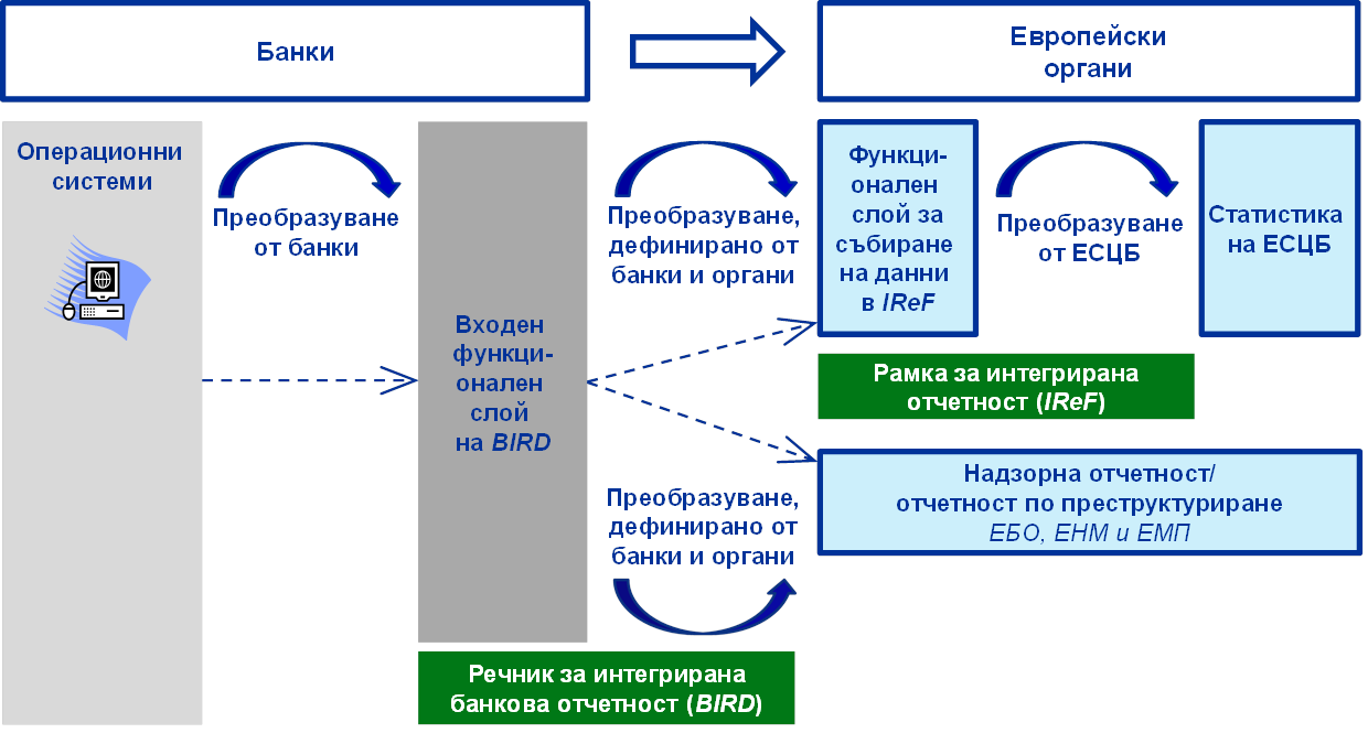 - Тук става въпрос главно за наборите от данни, свързани със задълженията за отчетност на институциите, приемащи депозити, които са посочени в: статистическите регламенти на ЕЦБ за балансовите позиции и лихвените проценти на парично-финансови институции; секторния модул на Регламента относно статистиката за държаните ценни книжа; Регламента относно събирането на подробни данни за кредитите и кредитния риск (АнаКредит).