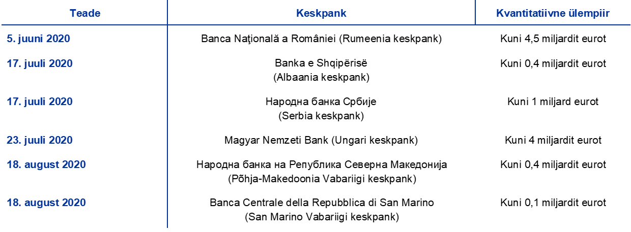 EKP pangandusjärelevalve pressiteade, 20. märts 2020. - Vt „ECB allows temporary relief in banks’ leverage ratio after declaring exceptional circumstances due to pandemic“, EKP pangandusjärelevalve pressiteade, 17. september 2020. Kiirkorras muudetud kapitalinõuete määrus võimaldab pangandusjärelevalveasutustel lubada pärast asjaomase keskpangaga konsulteerimist pankadel keskpankade vastu olevad nõuded finantsvõimenduse määrast välja jätta.