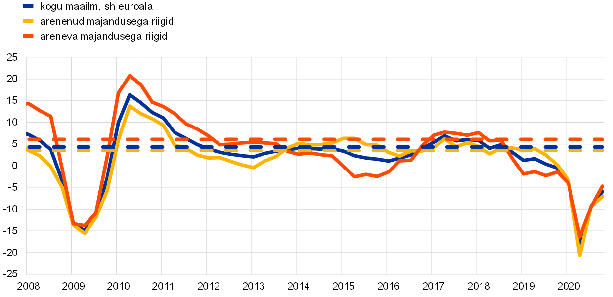 Märkused. Üleilmse kaubanduse kasv on üleilmse impordi, sealhulgas euroala impordi kasv. Pidevjooned tähistavad andmeid kuni 2020. aasta neljanda kvartalini. Katkendjooned näitavad pikaajalist keskmist (alates 1999. aasta neljandast kvartalist kuni 2020. aasta neljanda kvartalini). Viimased andmed pärinevad 25. veebruarist 2021.