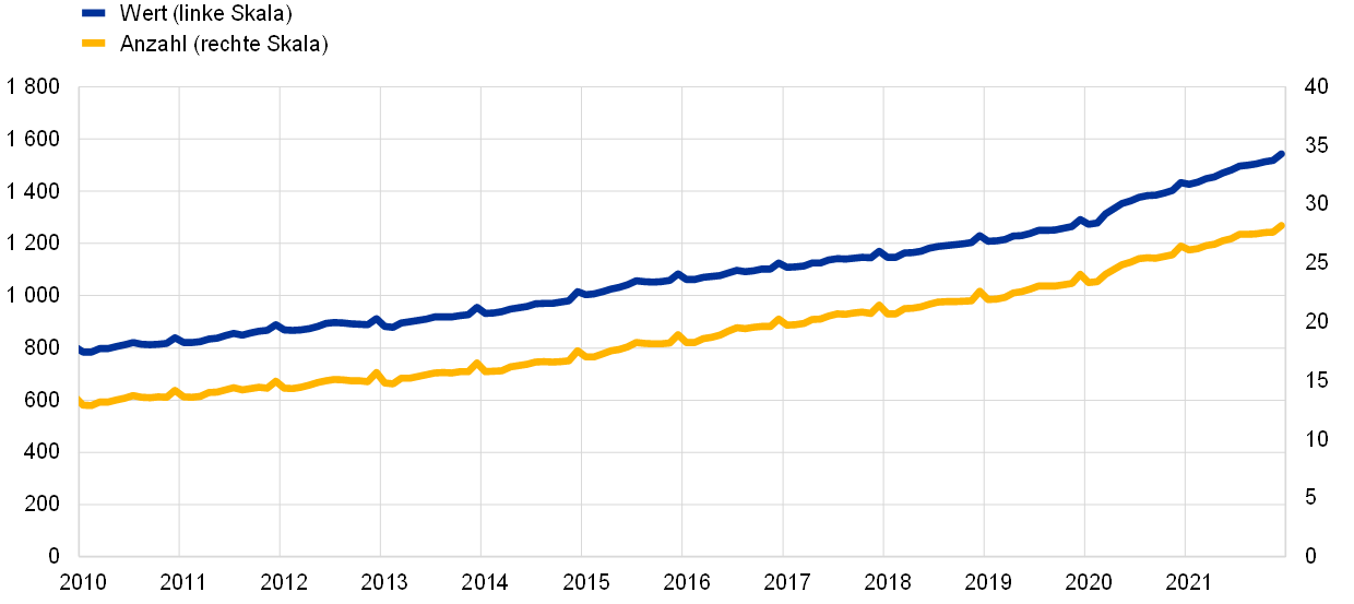 Anmerkung: Die jüngsten Angaben beziehen sich auf 2021 (linke Grafik) bzw. auf das vierte Quartal 2021 (rechte Grafik), das sich aus impliziten Monatswerten ergibt.