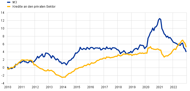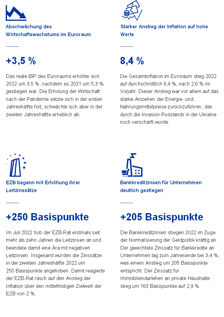 Die Teuerungsrate im Eurogebiet erhöhte sich von 2,6 % im Jahr 2021 auf 8,4 % im Berichtsjahr. Darin spiegelte sich im Wesentlichen die Erhöhung der Energie- und Nahrungsmittelpreise aufgrund des Krieges in der Ukraine wider. Der Preisdruck nahm in vielen Wirtschaftssektoren zu, wofür zuvor entstandene Lieferengpässe, ein gewisser Nachfragestau infolge der Corona-Pandemie sowie hohe energiepreisbedingte Vorleistungskosten in der Produktion verantwortlich waren. Nach einer guten Entwicklung in der ersten Jahreshälfte, in der insbesondere der Dienstleistungssektor von der Aufhebung der pandemiebedingten Beschränkungen profitierte, verlangsamte sich das Wachstum im Eurogebiet, was vor allem auf die Folgen des Krieges in der Ukraine zurückzuführen war.