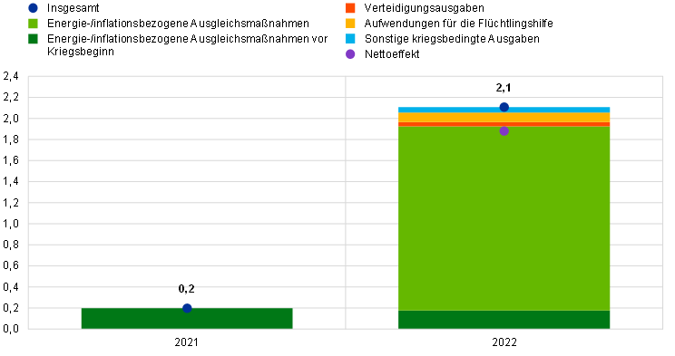 Als die Energiepreise Ende 2021 stärker zu steigen begannen, ergriffen die Euro-Länder Unterstützungsmaßnahmen im Umfang von rund 0,2 % des BIP. Dazu zählten Subventionen, die Senkung indirekter Steuern und Transferzahlungen an private Haushalte und Unternehmen. Im Berichtsjahr weiteten die Regierungen diese Maßnahmen aufgrund der russischen Invasion in der Ukraine rasch auf rund 1,9 % des BIP aus (siehe Abbildung 1.9); darunter fielen auch Vermögenstransfers an energieproduzierende Unternehmen. Zudem ließen unter anderem die Aufwendungen für Flüchtlinge sowie Militärausgaben die staatlichen Unterstützungen um 0,2 % des BIP steigen. Gegenfinanziert wurde die energie- und inflationsbedingte Unterstützung nur in geringem Umfang, beispielsweise durch die Anhebung der direkten Steuern für Energieerzeuger, die unerwartet hohe Gewinne erwirtschafteten. Der Nettoeffekt auf die öffentlichen Haushalte war daher beträchtlich und belief sich auf rund 1,7 % des BIP. In der Bruttobetrachtung betrug die gesamte diskretionäre Unterstützung (energie- und inflationsbedingte Maßnahmen, Aufwendungen für Flüchtlinge sowie Militärausgaben) 2,1 % bzw. abzüglich Neufinanzierung 1,9 % des euroraumweiten BIP (siehe Abbildung 1.10).