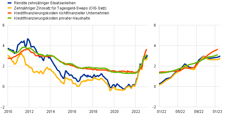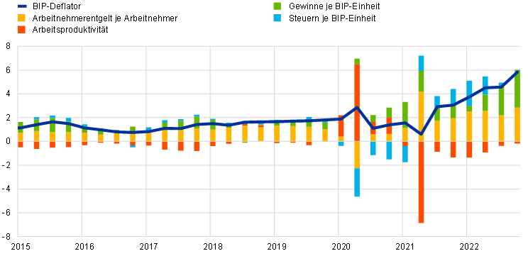 Das Jahr 2022 stellte einen Wendepunkt für die Geldpolitik der EZB dar. Die Wirtschaft wurde gleichzeitig von zwei Arten von Schocks getroffen, wodurch sich die Inflationsaussichten schlagartig änderten. Zum einen kam es im Euroraum zu einer beispiellosen Reihe negativer Angebotsschocks. Diese waren auf pandemiebedingte Lieferkettenstörungen, die nicht zu rechtfertigende Invasion Russlands in der Ukraine sowie die daraus resultierende Energiekrise zurückzuführen. Dies trieb die Vorleistungskosten in sämtlichen Wirtschaftssektoren stark in die Höhe. Zum anderen kam es durch das Wiederhochfahren der Wirtschaft nach der Pandemie zu einem positiven Nachfrageschock. Dadurch konnten Unternehmen ihre steigenden Kosten viel schneller und in größerem Maße als zuvor über die Preise weiterreichen.