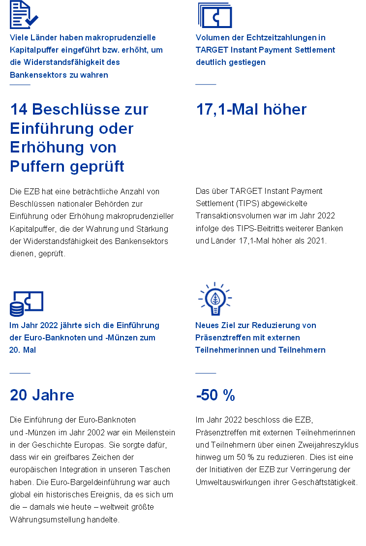 Darüber hinaus jährte sich 2022 die Einführung der Euro-Banknoten und -Münzen zum zwanzigsten Mal, ein Meilenstein in der europäischen Geschichte und ein greifbares Symbol der europäischen Integration. Bargeld ist und bleibt für die Menschen in Europa das am häufigsten verwendete Zahlungsmittel: Fast 60 % aller Zahlungen werden in bar abgewickelt, und es besteht kein Zweifel, dass Bargeld auch weiterhin eine wichtige Rolle im Leben der Menschen spielen wird. Angesichts der zunehmenden Digitalisierung der Wirtschaft müssen wir jedoch dafür sorgen, dass die Menschen in Europa auch Zugang zu sicheren, effizienten und bequemen digitalen Zahlungsmethoden haben. Aus diesem Grund prüft das Eurosystem die mögliche Einführung eines digitalen Euro. Im Rahmen der laufenden Untersuchungsphase verständigte man sich im Eurosystem im Jahr 2022 auf die wichtigsten Anwendungsfälle für einen digitalen Euro und traf mehrere grundlegende Entscheidungen über seine Ausgestaltung.