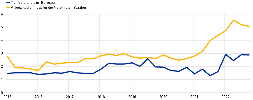 Siehe EZB, Arbeitsmarktentwicklung im Euro-Währungsgebiet und in den Vereinigten Staaten und ihr Einfluss auf die Löhne, Kasten 1, in: Lohnentwicklung und die maßgeblichen Einflussfaktoren seit Beginn der Pandemie, Wirtschaftsbericht 8/2022, Januar 2023.