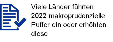 Elf Länder (Bulgarien, Deutschland, Estland, Irland, Frankreich, Kroatien, Zypern, Litauen, die Niederlande, Slowenien und die Slowakei) erhöhten 2022 den antizyklischen Kapitalpuffer. Luxemburg beschloss die Beibehaltung eines positiven Puffers. Was die Systemrisikopuffer anbelangt, führten zwei Länder (Deutschland und Slowenien) einen sektoralen Puffer ein, und Litauen behielt einen positiven sektoralen Puffer bei (Belgien hatte Ende 2021 beschlossen, anstelle des auf Wohnimmobilien angewandten Risikogewichts einen sektoralen Systemrisikopuffer einzusetzen). Österreich erhöhte seinen breiten Systemrisikopuffer, Bulgarien und Kroatien beschlossen die Beibehaltung ihres positiven allgemeinen Systemrisikopuffers.